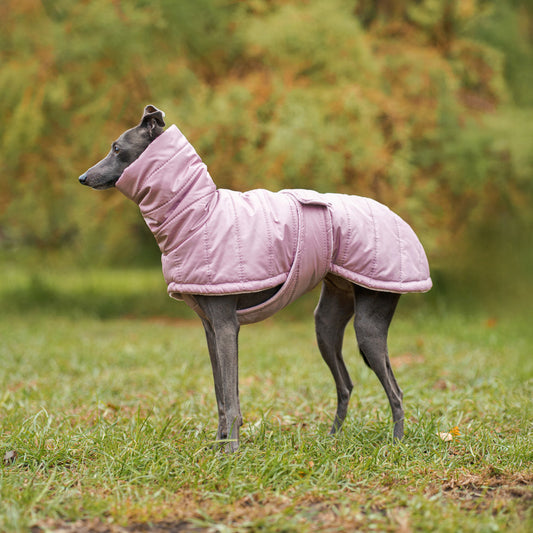 • Ocieplany płaszczyk przeciwdeszczowy dla charta z wodoodpornego ortalionu i regulowanym kołnierzem.