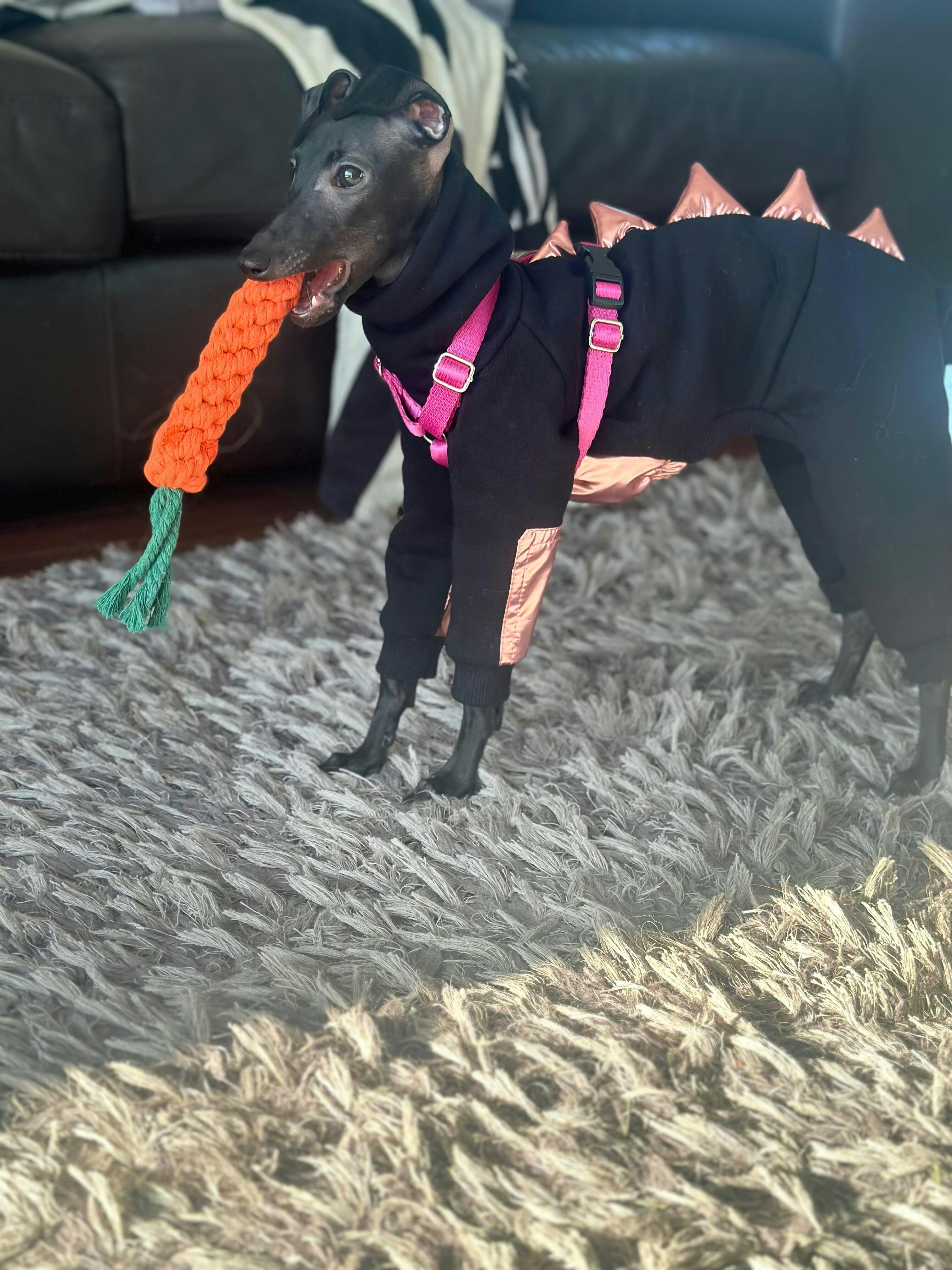A jumpsuit for Italian Greyhounds made from warm, soft brushed sweatshirt fabric. The waterproof inserts on the belly and front legs provide effective protection against moisture and prevent soaking, making it an ideal choice especially for male dogs when relieving themselves. The jumpsuit is also equipped with a functional leash opening in the collar, allowing you to securely attach the leash to the collar while ensuring comfort and full freedom of movement during walks.