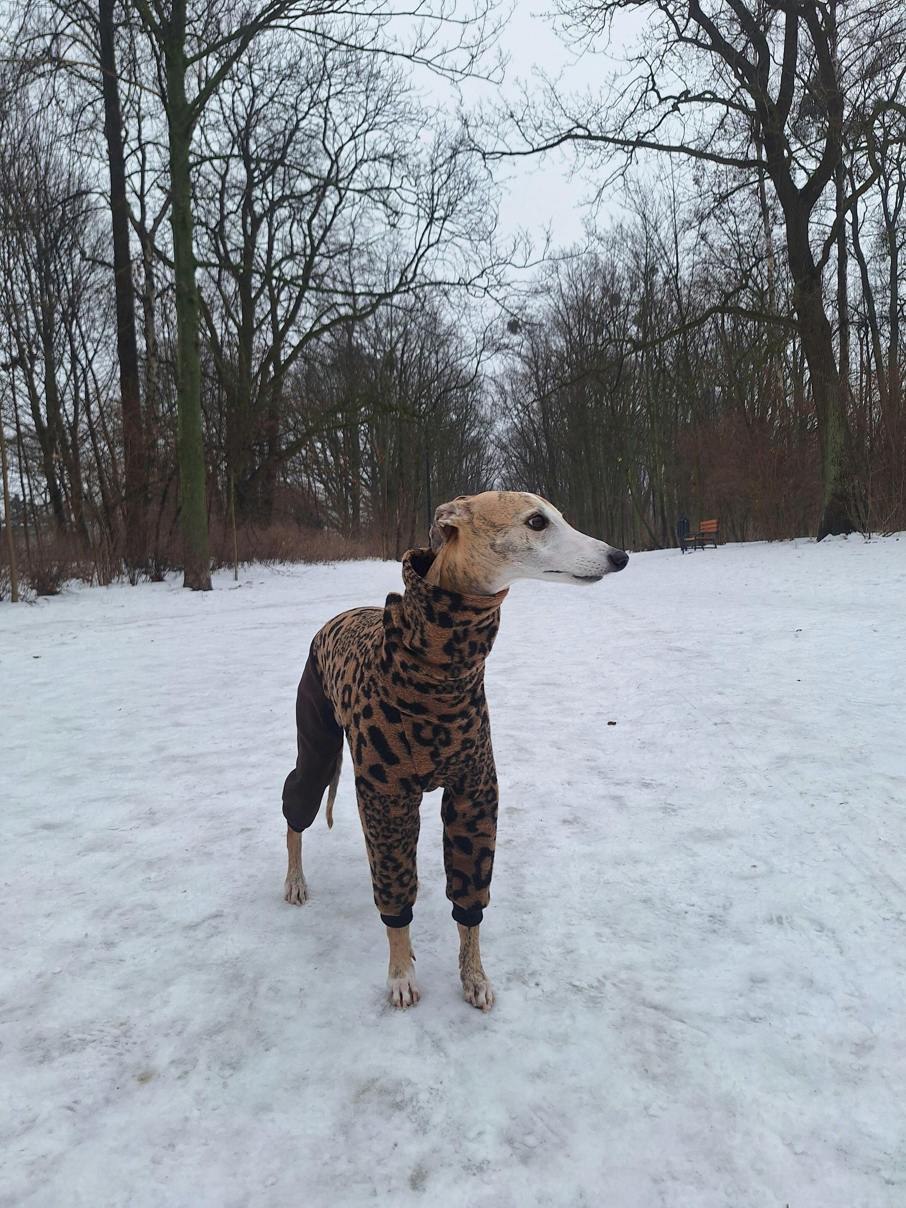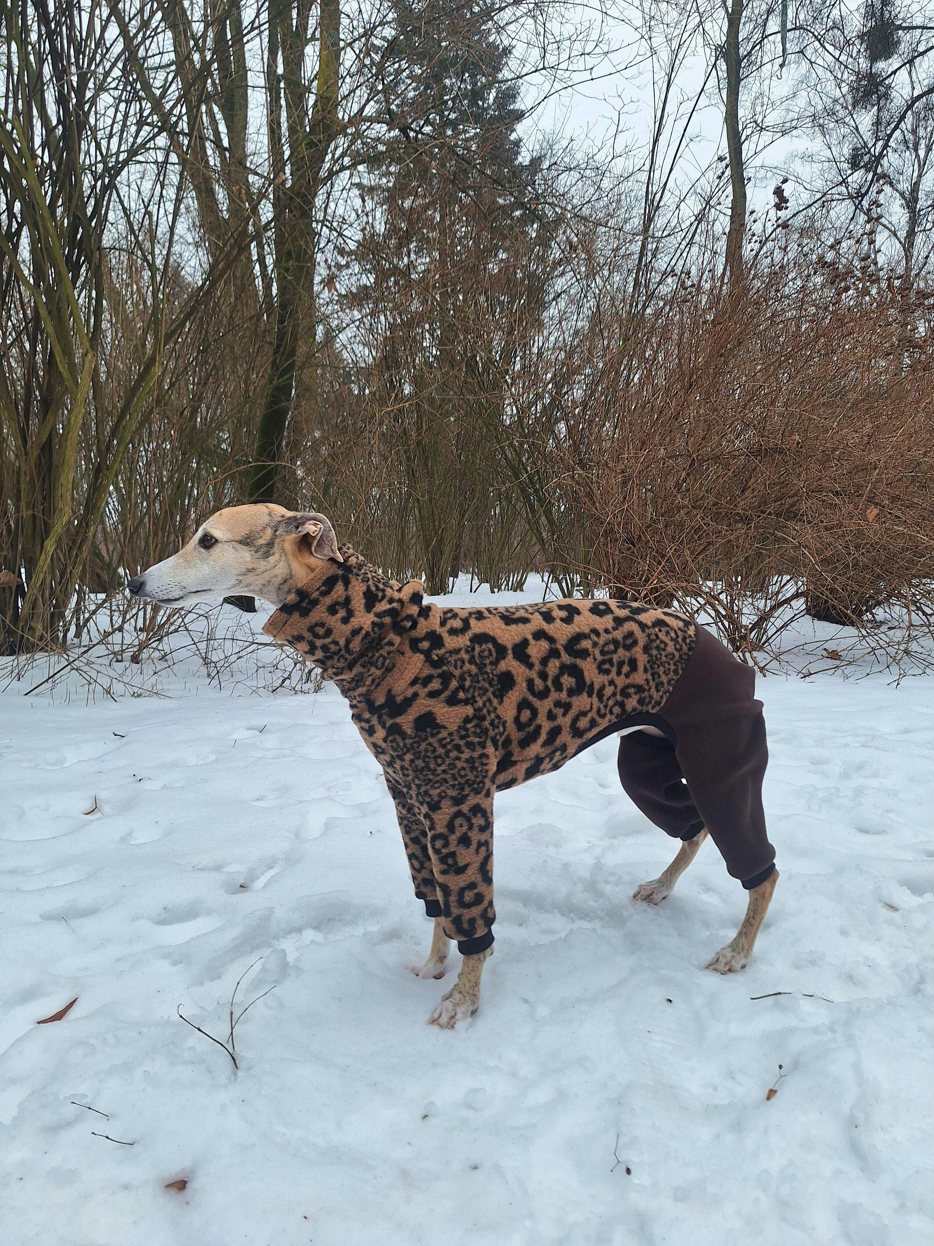 A warm jumpsuit for whippets made from wool knit with a leopard design. The wool provides natural protection against the cold and ensures comfortable wear.