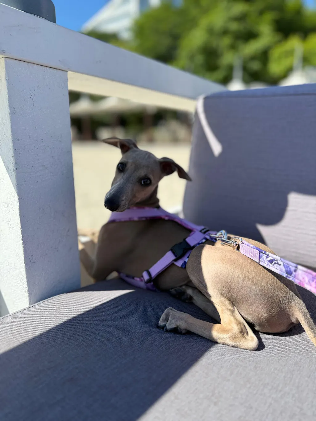 Szelki są wyjątkowo dobrze zaprojektowane z myślą o delikatnej budowie charcika włoskiego. Miękkie podszycie sprawia, że nic nie obciera nawet przy dłuższych spacerach. Świetnie dopasowują się do ciała, nie zsuwają się, nie krępują ruchów – widać, że zostały uszyte z dużą dbałością o szczegóły i komfort psa.