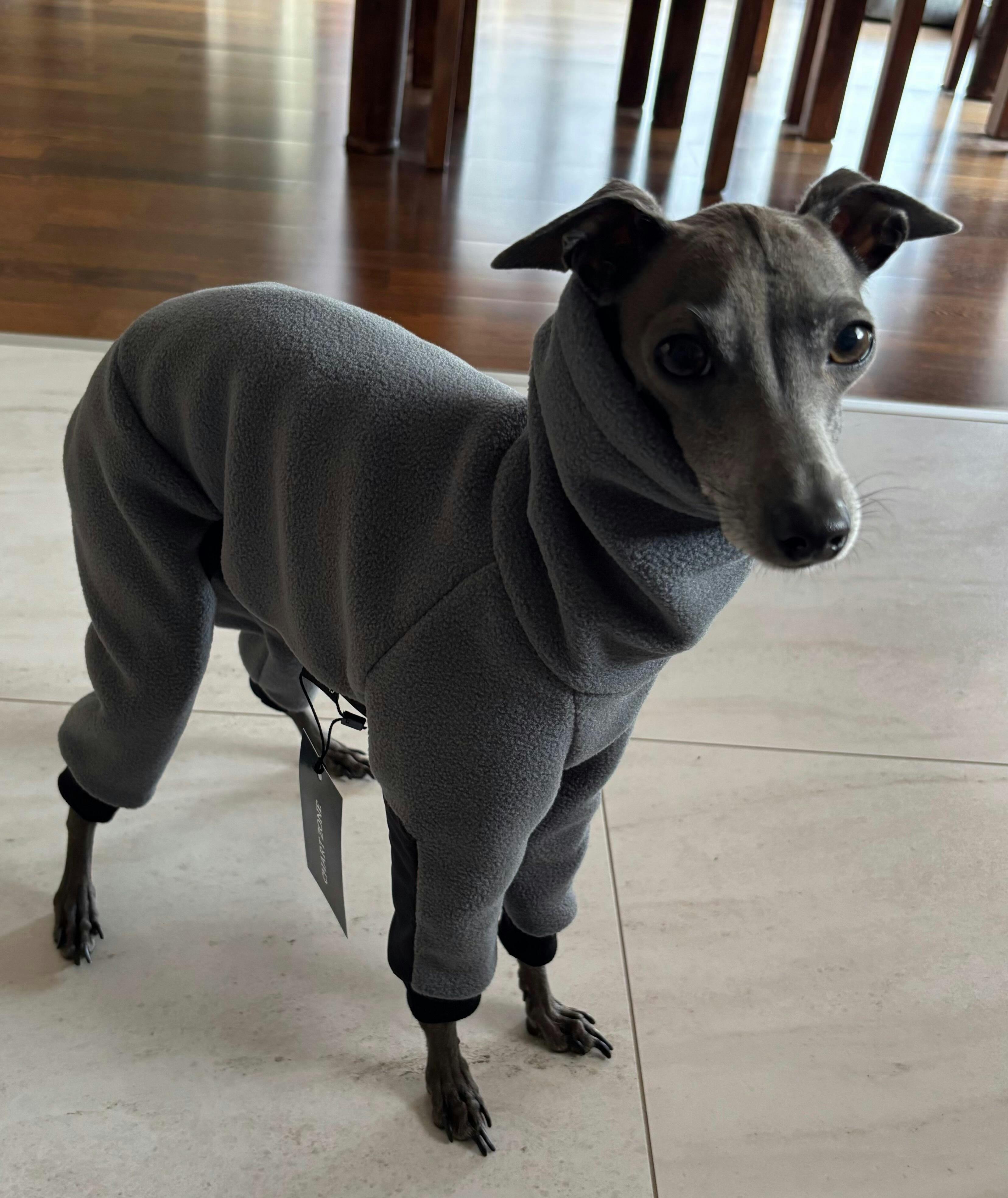 Kombinezon dla whippeta włoskiego wykonany z grubego, mięsistego polaru zapewnia doskonałą izolację termiczną gwarantując ciepło i komfort nawet w bardzo zimne dni. Polar charakteryzuje się właściwościami antypilingowymi i hydrofobowymi, co gwarantuje trwałość oraz ochronę przed wilgocią. Dodatkowo, posiada specjalną warstwę ochronną, która skutecznie spowalnia wchłanianie cieczy, oraz wysoką odporność na zagniecenia, dzięki czemu kombinezon zachowuje estetyczny wygląd przez długi czas.